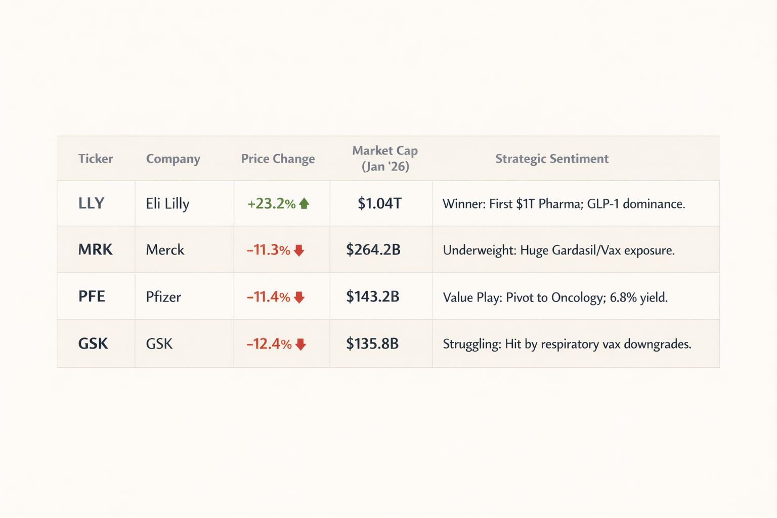 Merck (MRK) and Pfizer (PFE) felt the immediate burn. Both shed over 11% as blockbusters like Gardasil (HPV) were cut to a single dose and various rotavirus shots moved to "optional" status. Meanwhile, Eli Lilly (LLY) entered its Trillionaire Era, buoyed by a landmark TrumpRx deal that trade-locked Medicare access for Zepbound in exchange for MFN pricing concessions (Washington Post, BioPharma Dive).