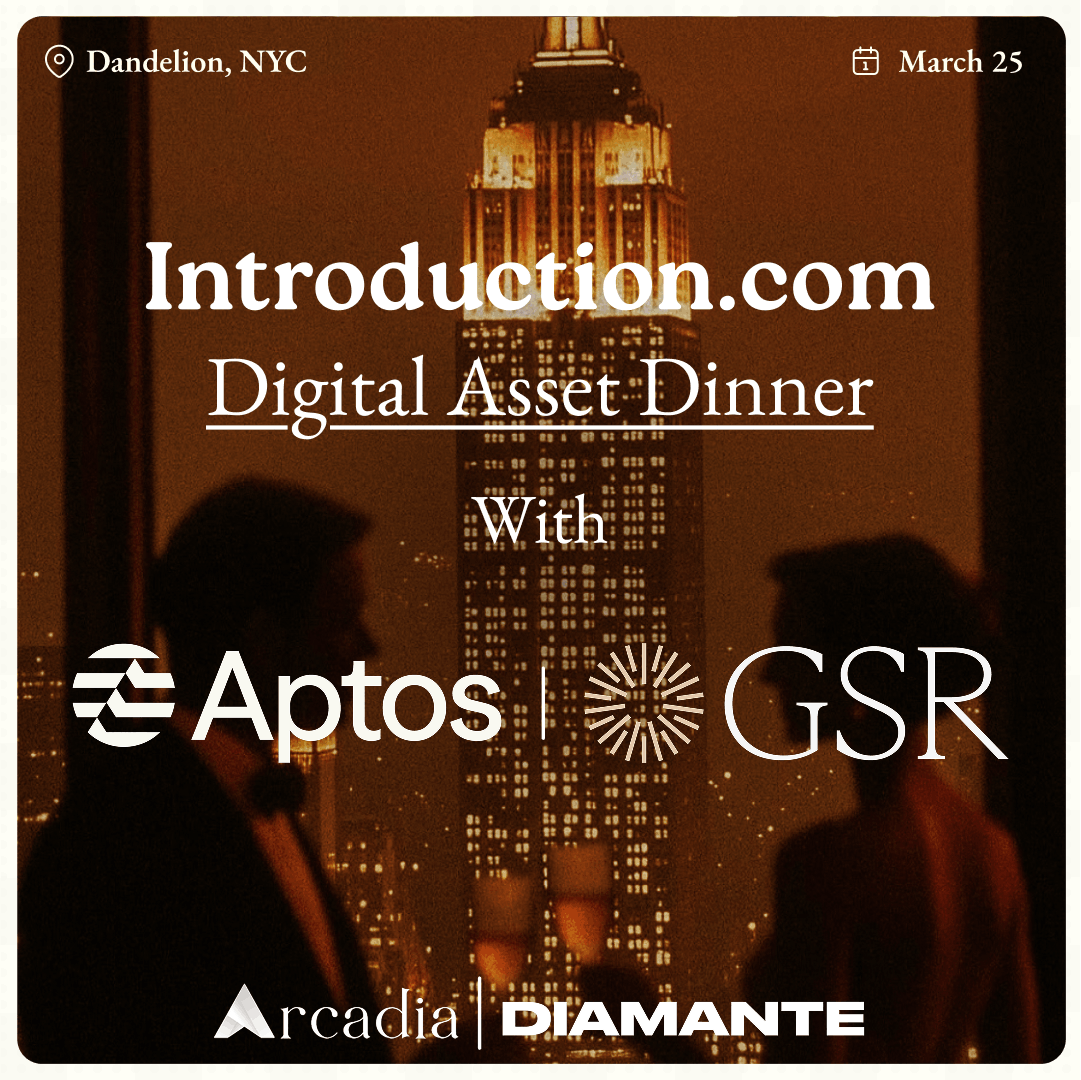 Dinner I: occupies an intimate West Village cocktail bar, co-hosted with Aptos & GSR and powered by Arcadia. We’ve curated a room where the leadership of a16z, Pantera, and Framework meets the heads of digital assets from Fidelity, WisdomTree, and J.P. Morgan — the kind of people who don't do panels. Expect real conversations: capital formation, go-to-market, and the moves being made by the few who shape the many.